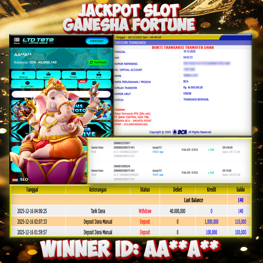 LTDTOTO JACKPOT GANESHA FORTUNE RP 40.000.000 SELASA 16 DESEMBER 2025