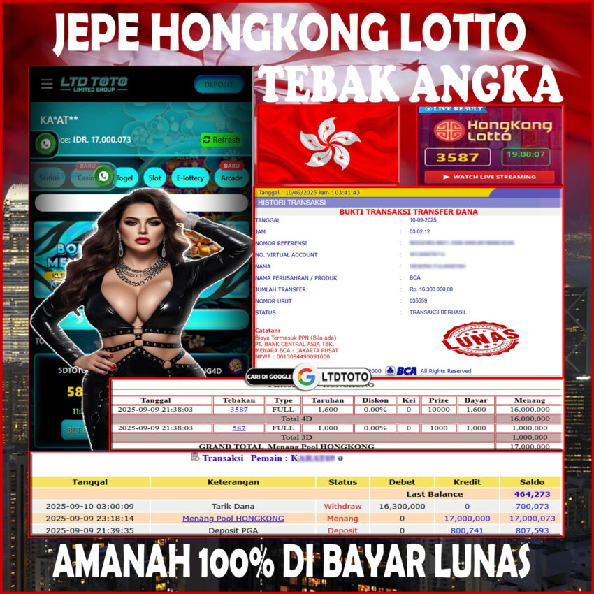 Selamat kepada User id : KA*AT** Telah berhasil mendapatkan kemenangan besar pada permainan HONGKONG LOTTO, kemenangan Sebesar Rp.16.000.000, Setelah mengisi formulir withdraw dengan kurang waktu hanya 5 – 10 menit pihak LTDTOTO sudah melakukan transfer kepada pemilik User id dan dana sudah dapat di cairkan oleh pemenang. Bukti pembayaran yang kami berikan merupakan bukti pembayaran yang SAH / VALID yang langung di dapatkan melaui tanda transfer transaksi dari Bank yang di tuju. Kami mengucapakan banyak Terima Kasih Kepada pemenang karena sudah mempercayakan kami sebagai Bandar Tepercaya yang membayar semua kemenangan member hingga lunas. Masih ragu dengan LTDTOTO bos ? Di mana bandar togel online sekarang yang terpercaya seperti LTDTOTO? Bandar yang mengirimkan kemenangan member tanpa bertele – tele. Jadi…. tidak perlu khwatir pada situs LTDTOTO karena kemenangan anda berapapun akan dibayarakan hingga lunas kepada pemenang.