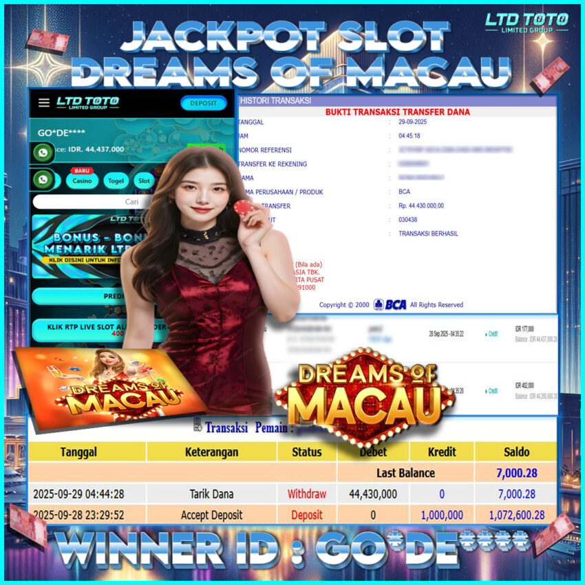 LTDTOTO JACKPOT SLOT DREAMS OF MACAU RP 44.430.000 SENIN 29 SEPTEMBER 2025